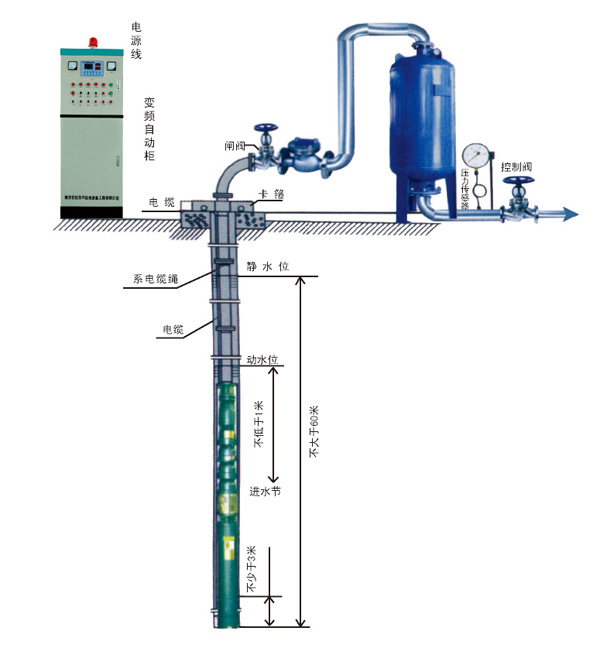 深井無塔供水設(shè)備井水加壓方案應(yīng)用于廠礦、公共建設(shè)、工地施工等水源是機井的情況。深井加壓設(shè)備變頻器具有很強的保護