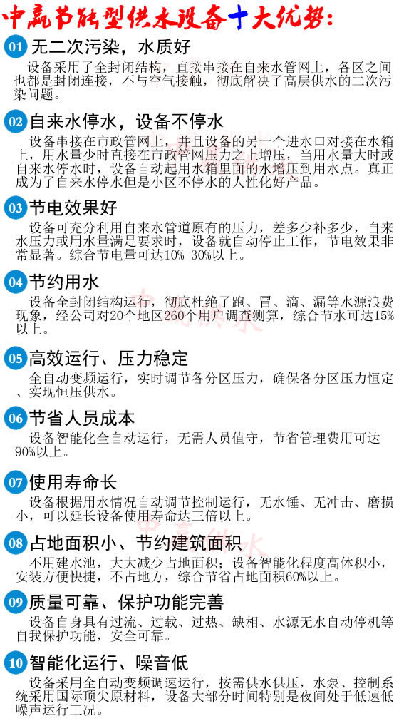 1、 設(shè)備直接串聯(lián)在自來水官網(wǎng)上,不用建水池,節(jié)約大量土地和資金。