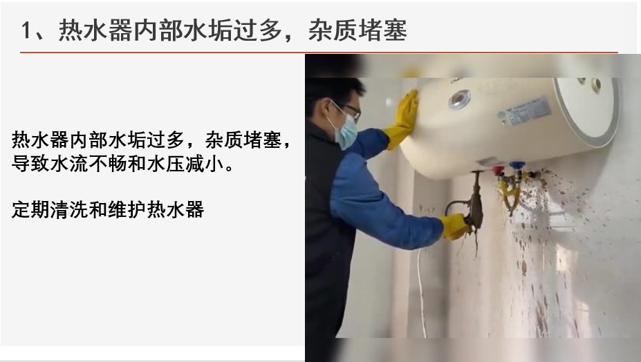 1、熱水器內(nèi)部水垢?,雜質(zhì)堵塞,導(dǎo)致水流不暢。